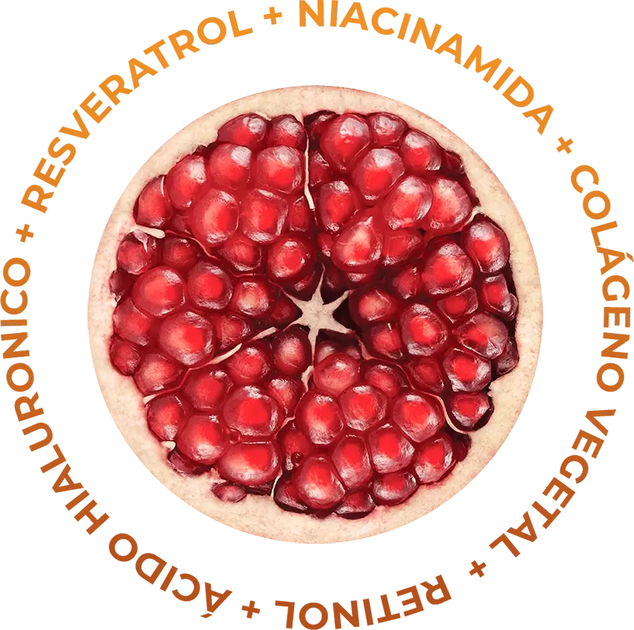 3˚ Retinol + Ácido Hialurônico ao combinar esses elementos com o extrato de romã, a rapidez da regeneração celular da pele é percebida em menos de 7 dias, o que reduz visualmente linhas de expressão.